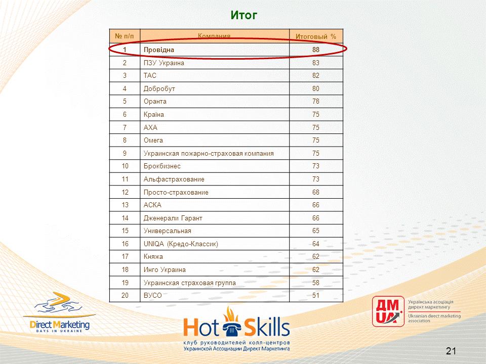 Лидером стала СК «Провідна». Хотя и ее результат – всего лишь на удовлетворительном уровне, а о максимальном количестве баллов речь в данном исследовании пока не идет. Тем не менее, приятно, что новые компании, которые появились в итоговой таблице впервые, сразу же заняли достаточно высокие позиции.