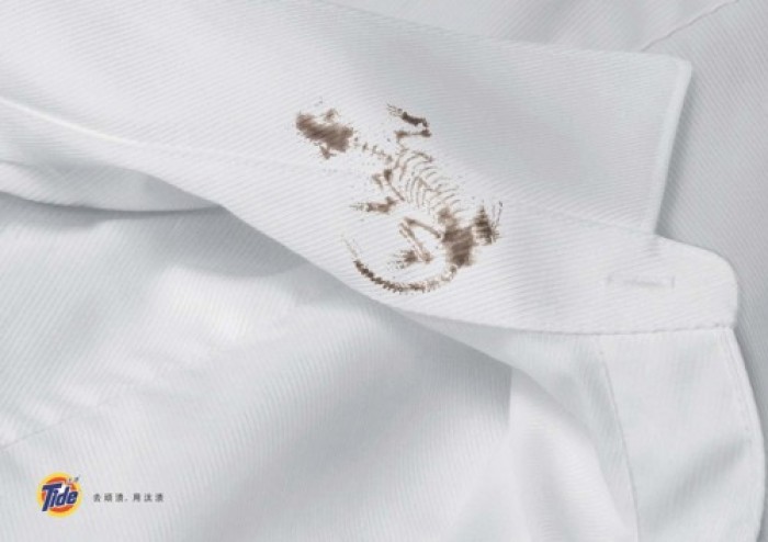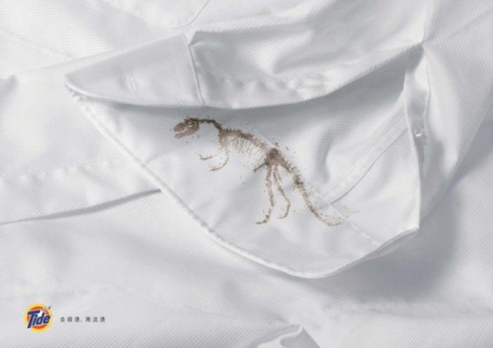 Порошок Tide, как нам заявляет китайский филиал рекламного агентства Leo Burnett, отлично отстирывает не только свежие пятна, но и совсем старые. Это сообщение до нас доносят с помощью изображений ископаемых животных на белых рубашках.