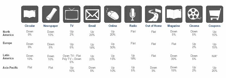 Другие медиа-каналы рискуют потерять часть аудитории. Газетам многие предпочтут доступный и оперативный по информации Интернет. Журналы с снижением уровня доходов могут перейти в категории излишеств. Кино может постигнуть та же печальная участь. Потребление радио возможно не будет затронуто, наружная реклама - останется на том же уровне или немного снизится. Прогноз тенденции развития медиа потребления по регионам (данные Publicis Group) – в таблице.