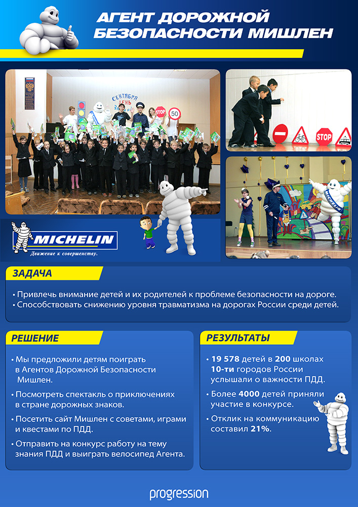 Два вторых места и одно – третье – завоевало агентство Progression, в номинациях: «Лучшая кампания b2b» - за проект «Он-лайн вечеринка Progression», «Лучший проект с использованием новых технологий» - за проект «Он-лайн вечеринка Progression» и «Лучшая социально-ориентированная кампания» - за проект «Агент Дорожной Безопасности Мишлен».