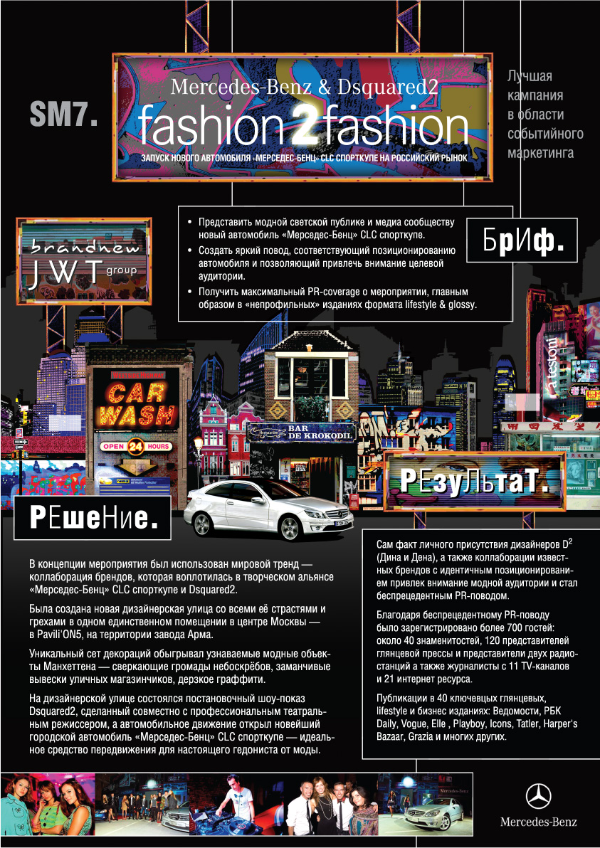 Одним из таких обладателей стало агентство BrandNew (входящее в Группу Progression), завоевавшее золото в номинации: «Лучшая кампания в области событийного маркетинга» за проект «Mercedes-Benz & Dsquared2. Fashion2Fashion».