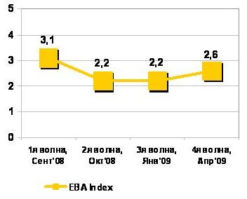 По результатам июньской волны исследования «Индекс Инвестиционной привлекательности Украины» (EBA Investment Attractiveness Index) продемонстрировал небольшой рост по всем индикаторам и достиг значения 2,6 по 5-бальной шкале. Это первый положительный показатель после резкого падения в сентябре-октябре 2008 года и дальнейшей стабилизации на низком уровне на протяжении периода ноябрь 2008-февраль 2009г.