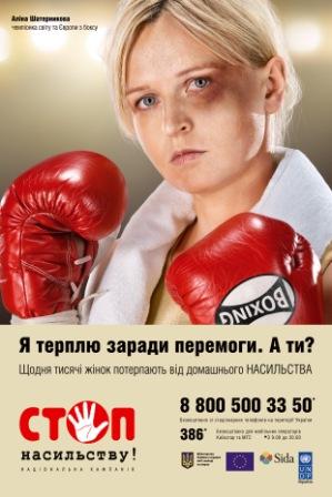 В рекламе снялась чемпионка мира и Европы по боксу Алина Шатерникова. Из ситилайтов и билбордов, которые размещены по всей Украине девушка призывает женщин не терпеть домашнее насилие, не быть пассивной жертвой и не молчать.