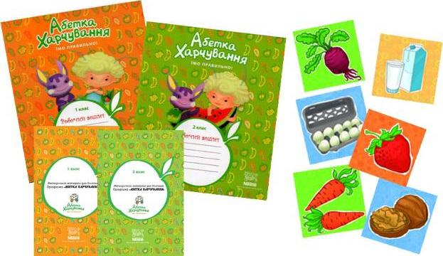 Навчально-методичний комплект «Абетка харчування» включає в себе методичні матеріали для вчителя, сучасні яскраві робочі зошити для дітей та дидактичний матеріал – картки для ігор.