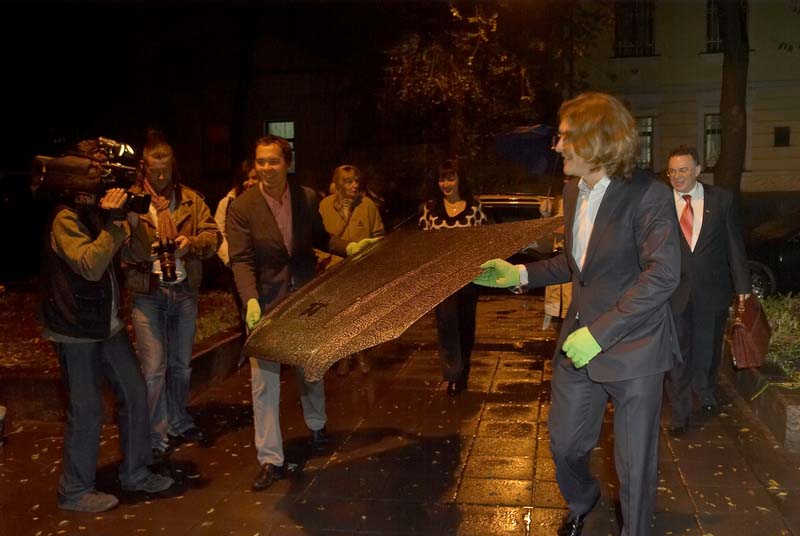 В первый день акции состоялась презентация с присутствием автора, который порадовал гостей беспрецедентным хэппенингом в элементами осчастливлинга (слово, придуманное автором в процессе подготовки выставки). Кульминация «осчастливлинга» - это полный капец, вернее, капот от автомобиля «Тоwарищ» с томографической росписью «COVER»! Он был торжественно снят с автомобиля и внесен автором и его товарищем Глебом Тимошенко в зал галереи и установлен на мольберт на глазах у изумленной публики.