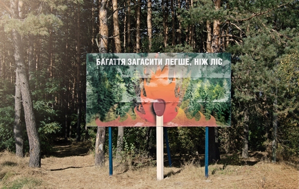 В жизни креатив, разработанный агентством TABASCO по заказу Комитета Лесного Хозяйства, выглядит вот так. Нестандартные конструкции размещены возле лесных насаждений и вдоль дорог во всех регионах Украины.
