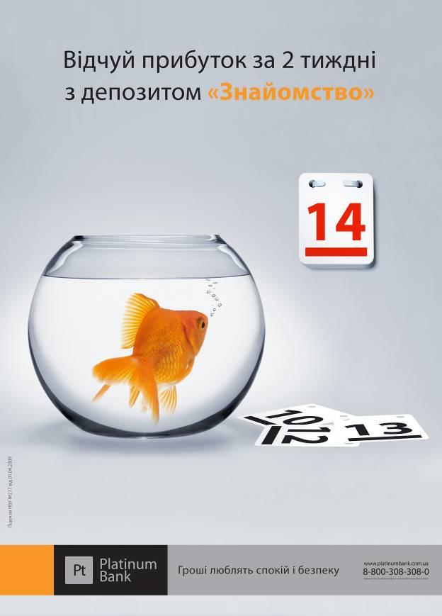 Как комментирует Анджей Олейник, заместитель финансового директора, директор по маркетингу Platinum Bank: «Мы выбрали образ золотой рыбки, поскольку он несет простое и понятное сообщение. В целом, рыбки ассоциируются с умиротворением, а золотая рыбка – это символ надежности и процветания. Мы бы хотели, чтобы наши клиенты через образ золотой рыбки ощущали спокойствие и понимали, что их финансовое будущее надежно защищено и будет приумножено. К тому же, эту концепцию мы планируем использовать не только для депозитов, но и расширять ее в будущем».