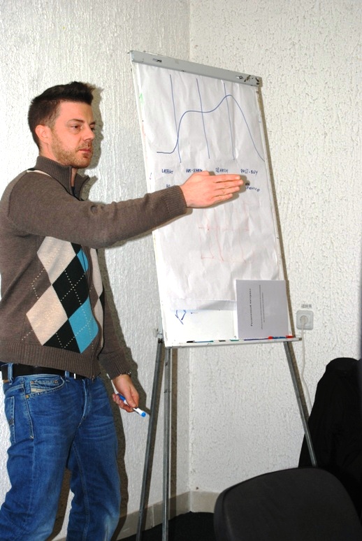 Практика без теории – ничто, поэтому вначале занятий прошли лекции. Анже рассказал о премудростях и законах бренд-нейминга а Юрко – о визуальных коммуникациях и основах бренд-айдентики. Также спикеры рассказали о том, какие существуют каналы коммуникаций, какие бывают креативные сообщения и как сделать, чтобы аудитория их заметила. Кроме того была раскрыта структура работы команды – брифинг, дебрифинг, брейнсторминг, презентация и т.п.
