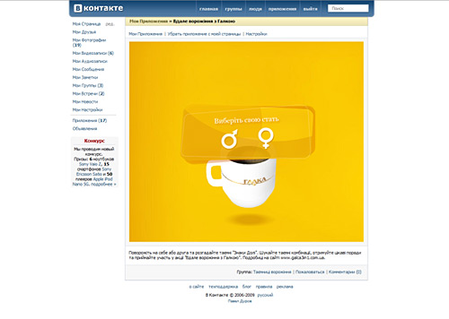 В поддержку рекламной кампании в социальной сети Vkontakte были размещены соответствующие информационные баннеры и создана группа любителей (http://vkontakte.ru/club11285673 )различных видов гаданий. Кроме прочего, ее участники могут воспользоваться он-лайн приложением (http://vkontakte.ru/app1730804_4855163 )от «Галки» — гаданием на кофейной гуще. Его механизм достаточно простой: пользователю нужно указать свой пол, выбрать, на кого гадать (себя, друга или подругу) и повращать виртуальную чашку с кофейной гущей. После проведенных манипуляций на ней остаются запечатленными 3 символа, интересной расшифровкой которых можно не только насладиться самому, но и отправить другу по почте. Узнав результаты гадания, пользователи также имеют возможность принять участие в акции от ТМ «Галка», заполнив он-лайн анкету.