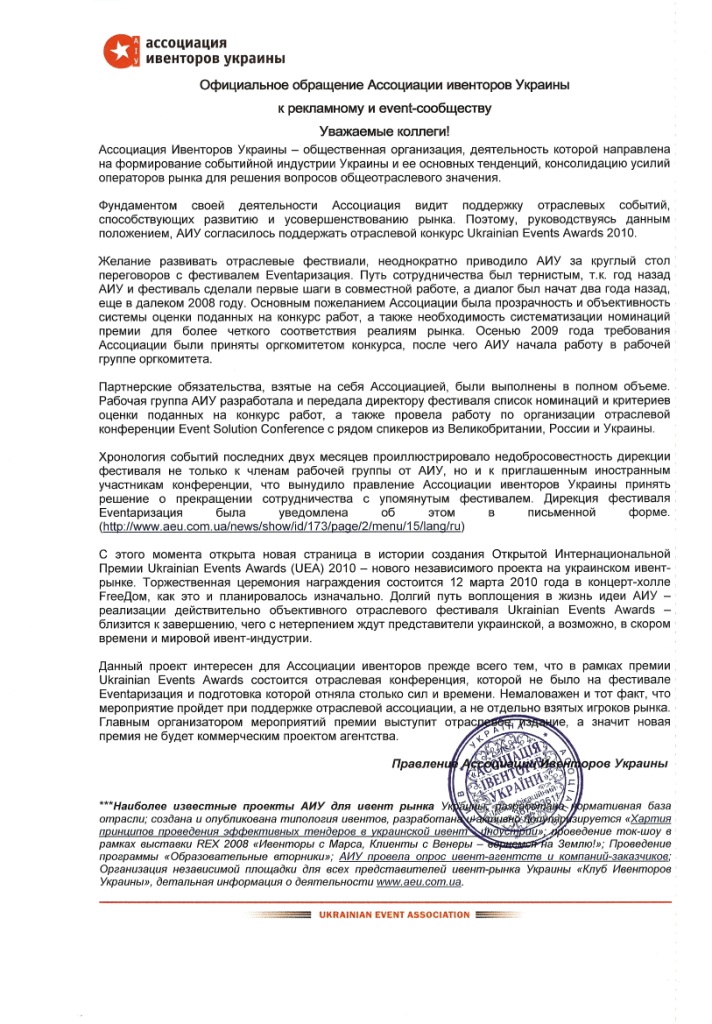 Официальное обращение Ассоциации ивенторов Украины к рекламному и event-сообществу
