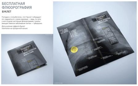 В основе буклета лежит простая идея: человек получает на руки информационную листовку, выполненную в виде рентгеновского снимка и отпечатанную на плотной кальке. На снимке – легкие, пораженные туберкулезом, вид которых заставляет задуматься над своим здоровьем. Следующий шаг – сделать флюорографию в ближайшем специальном пункте (их адреса приведены в буклете), поскольку предупредить или хотя бы вовремя распознать болезнь намного легче, чем лечить ее.