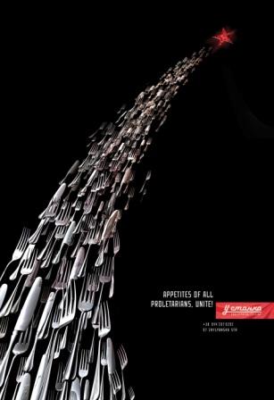 Рецепт приготовления принта: берем один из самых известных коммунистических лозунгов, слегка перемешиваем, добавляем главный атрибут «совка» - красную звезду, затем приправляем все столовыми приборами и даем немного настояться для полноты вкуса. Блюдо готово к употреблению.