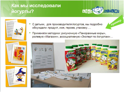 Также нужно хорошо понимать, что спрашивать, как формулировать эти вопросы, и как делать потом выводы на сновании детских ответов. Кроме того, в данном случае относительно любых действий - исследовательских, маркетинговых, рекламных - существует определенная законодательная база. Наши действия всегда этичны и не нарушают установленных норм и правил. Поймать ребенка на выходе из школы и начать задавать ему вопросы - это не наш метод. Это всегда делается только с разрешения взрослых.