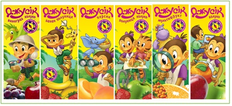 В итоге сок «Джусик» имеет вкусы и выглядит в соответствии с пожеланиями мам и детей. Герой бренда - любознательная обезьянка Джу, которая ищет и собирает фрукты в джунглях, а также часто попадает в приключения вместе с друзьями. Этот бренд будет не только развлекать, но и нести познавательную функцию: изучать вместе с детьми животный и растительный мир разных регионов мира. Новинка для рынка - оригинальная турбо-трубочка, которая имеет не привычное одно, а три отверстия.