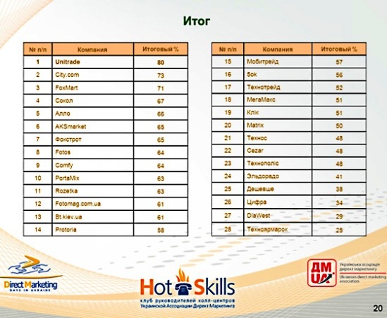 Наконец-то владельцы и руководители интернет-магазинов смогли объективно оценить уровень качества телефонного обслуживания своих клиентов. Это стало возможно благодаря озвученным Денисом Любивым, генеральным директором Contactis, Марией Романенко, аналитиком Украинской ассоциации директ маркетинга, результатам первого исследования качества телефонного обслуживания интернет-магазинов, магазинов бытовой техники и электроники.