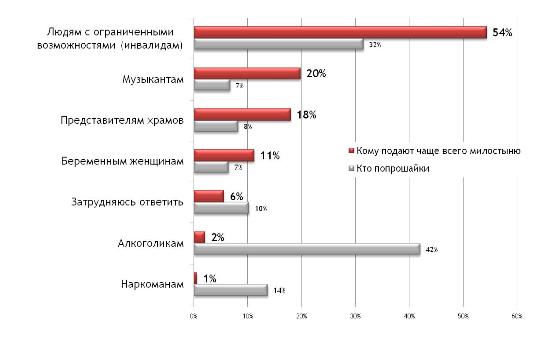 Кто есть кто. В большинстве попрошаек респонденты видят алкоголиков, но денег им достается меньше остальных, поскольку в данном случае преобладают чувства призрения и брезгливости, а попрошайничество воспринимается однозначно как заработок. Четко просматривается разделение восприятия попрошайничества (алкоголики, инвалиды, нуждающиеся и пр.) и милостыни (представители храмов, пожилые женщины у церкви). Интересно, что среди «просящих» достаточно охотно дают деньги музыкантам – некая дань честной форме попрошайничества. Но неоспоримыми «лидерами продаж» являются люди с ограниченными возможностями (свыше 50% опрошенных чаще всего подают именно им).