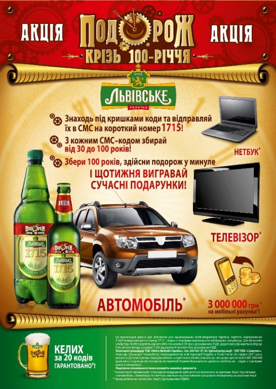 Необходимо приобрести «Львовское» в акционной упаковке, найти под крышкой код и отправить его на короткий номер 1715. После чего в ответ получить сообщение с количеством лет - от 30 до 100. Путешествие в прошлое, по меньшей мере, на 100 лет в течение месяца дает возможность принять участие в розыгрыше специальных денежных подарков на покупку автомобилей, телевизоров и нетбуков. Механика акции проста - чем больше лет преодолеешь, тем больше подарков истории сможешь получить!