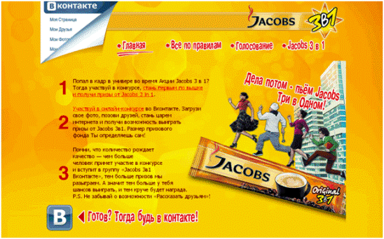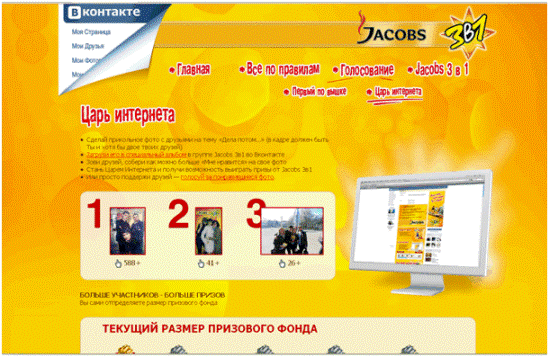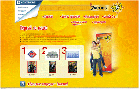 Уникальность данного проекта обусловлена тем, что помимо BTL-активностей проекта агентством Ark Connect был привлечен дополнительный коммуникационный канал – активация рекламной кампании в сети Интернет. Фоторамки и листовки содержат приглашение для участников Акции посетить брендированный сайт Jacobs 3in1 - www.jacobs3in1.ru. Фотографии, сделанные в ВУЗах, загружаются организаторами рекламной Акции в группу на сайте www.vkontakte.ru, где предусмотрено онлайн-голосование. Помимо этого, каждый желающий может присоединиться к группе, загрузить свою фотографию и голосовать за нее вместе со своими друзьями. Авторы лучших фотографий будут награждаться призами от Jacobs 3in1.