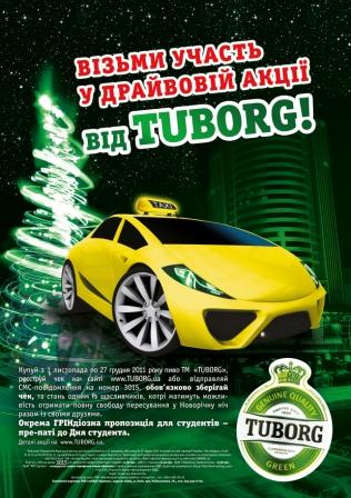 ТМ Tuborg дарит украинской молодежи новое DRIVEвовое промо! Покупай с 01 ноября по 27 декабря пиво Tuborg, регистрируй оплаченные чеки и выигрывай!  Первый подарок – это зажигательная вечеринка Drive Bus Party на День Студента, ну а второй улетный сюрприз - бесплатное такси на всю Новогоднюю ночь!