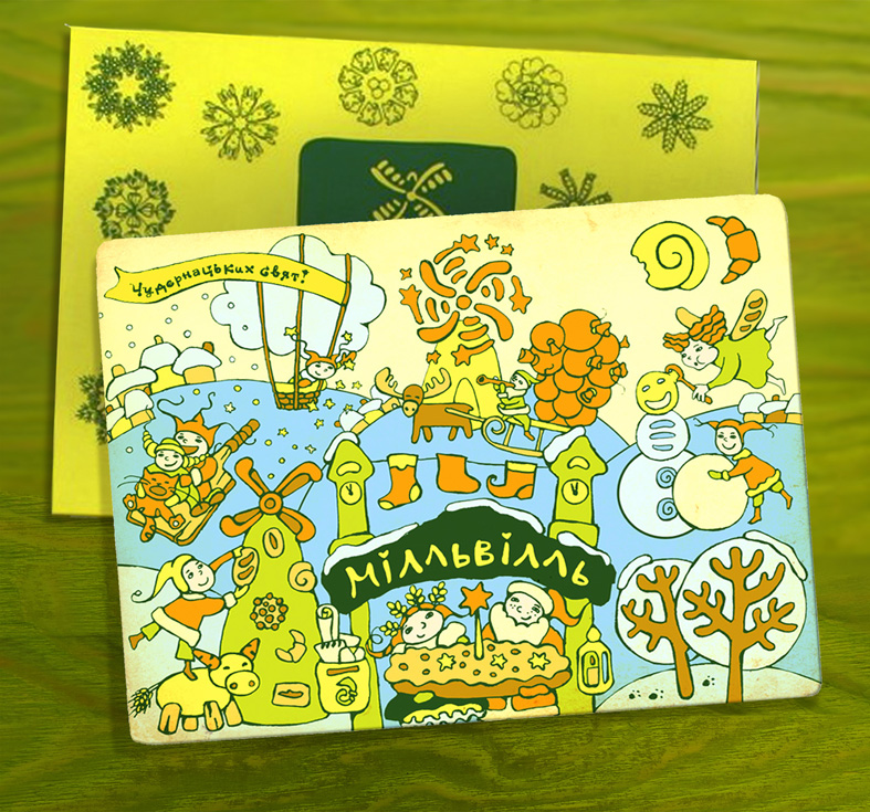 К Новому году мы рисовали тоже нашу деревушку, но в предновогодних хлопотах. А также были различные подарки – пазлы для детей, смешные милльвилльские шапочки.
