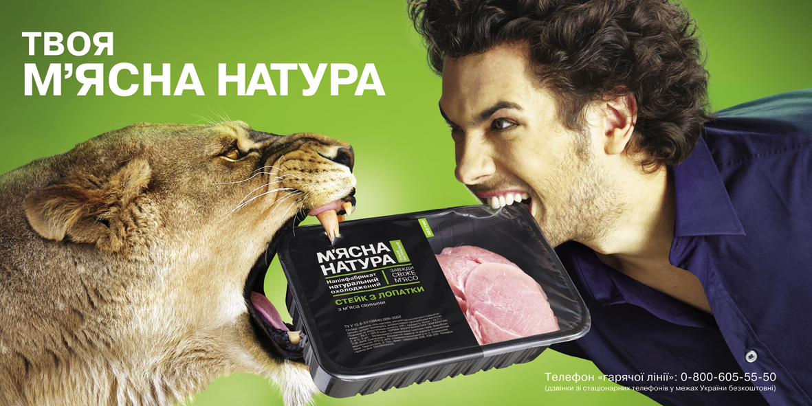 Даже если вы самый заядлый веган, устоять перед продуктами этой торговой марки будет очень непросто! Ведь не зря старалась команда рекламного агентства Euro RSCG Kiev, которая в рамках сотрудничества с крымским брендом охлажденных мясных полуфабрикатов «Мясная натура» разработала ряд креативных материалов, способных открыть настоящую мясную натуру в каждом.