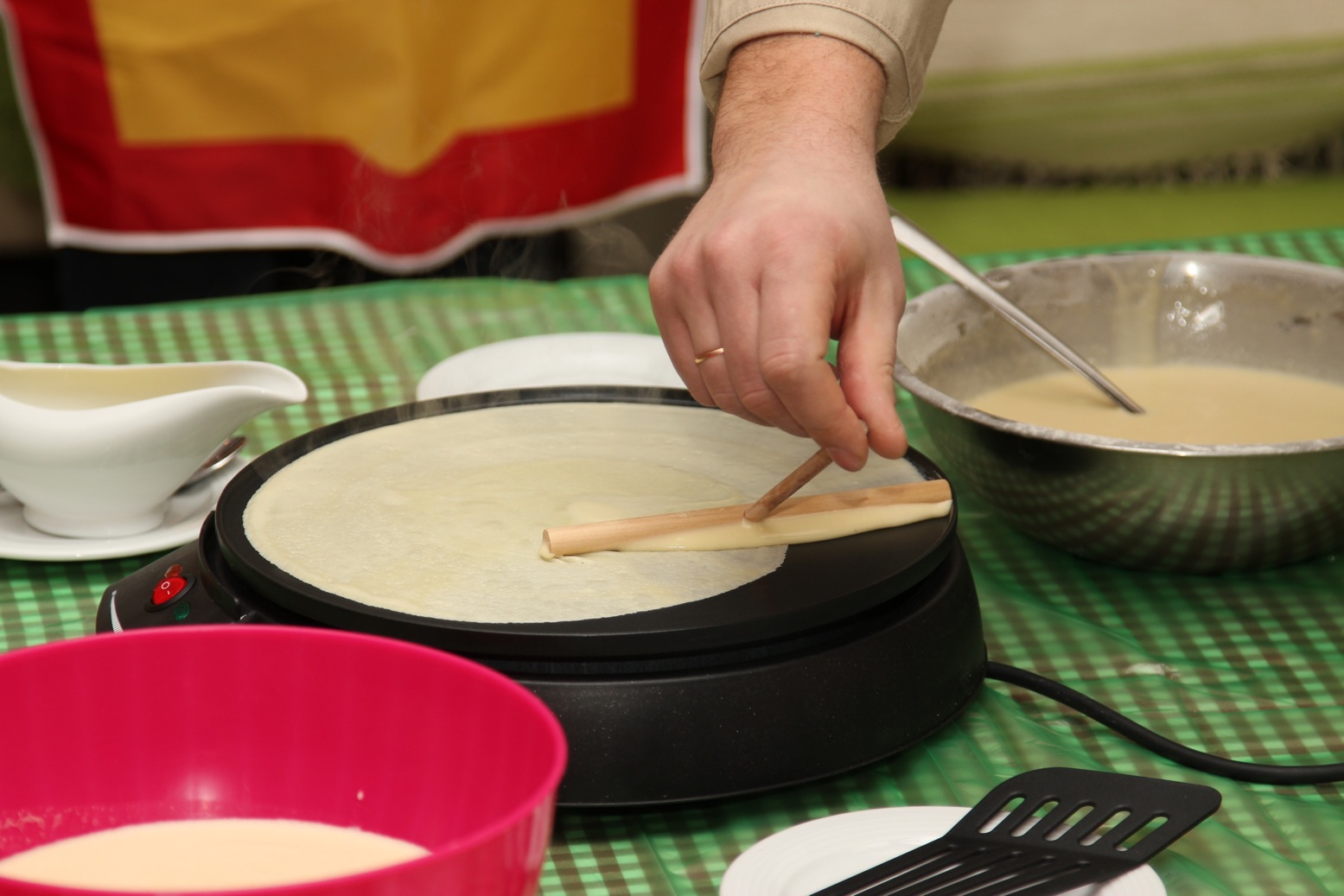 В рамках мероприятия был проведен кулинарный мастер-класс по выпеканию блинов. Участники собственноручно смогли поучаствовать. Взялись за это дело с удовольствием и инициативой. Стояли над плитой до последней капли теста. Результат был на праздничном столе – хватило всем!