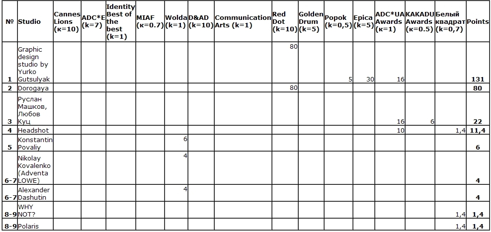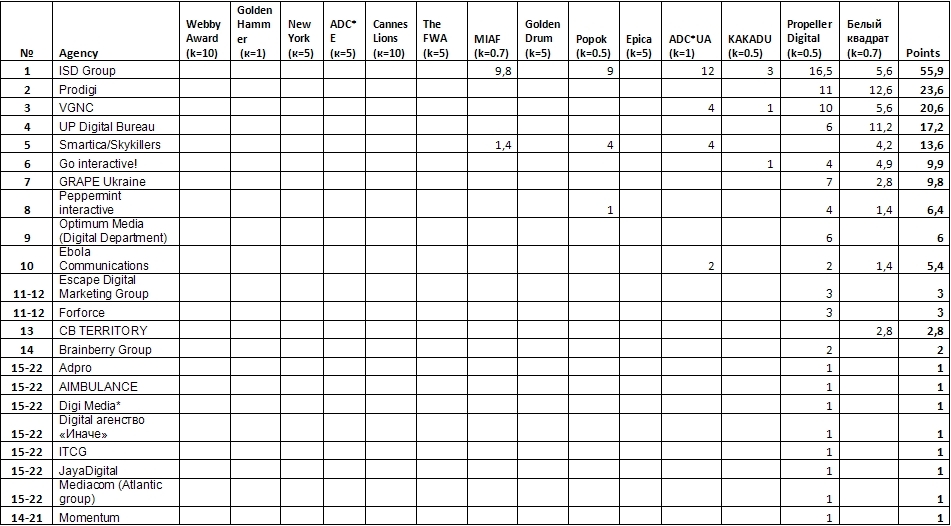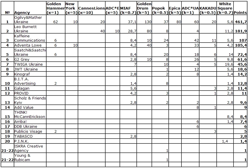 Всеукраинская рекламная коалиция накануне 13-го Киевского Международного Фестиваля Рекламы представляет промежуточные рейтинги креативности украинских креативных агентств, digital агентств и дизайн-студий.
