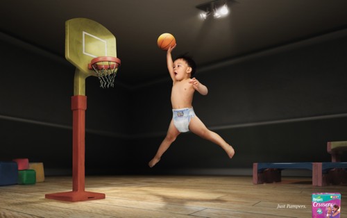 Эти рекламные принты, созданные для подгузников Pampers, призваны донести до потребителей следующую мысль: малышу будет настолько удобно в этих подгузниках, что вместо обычных игр он предпочтет большой спорт и устроит из вашей квартиры стадион.