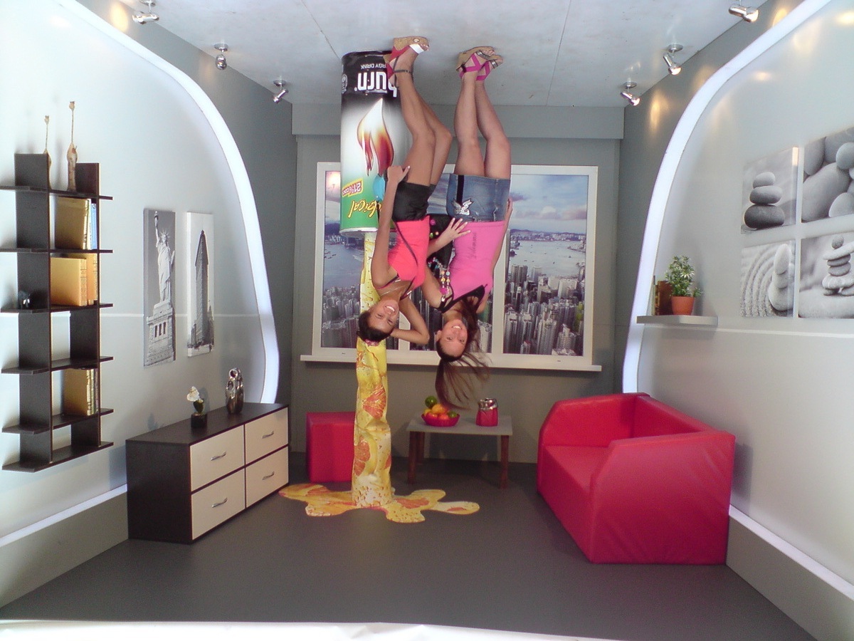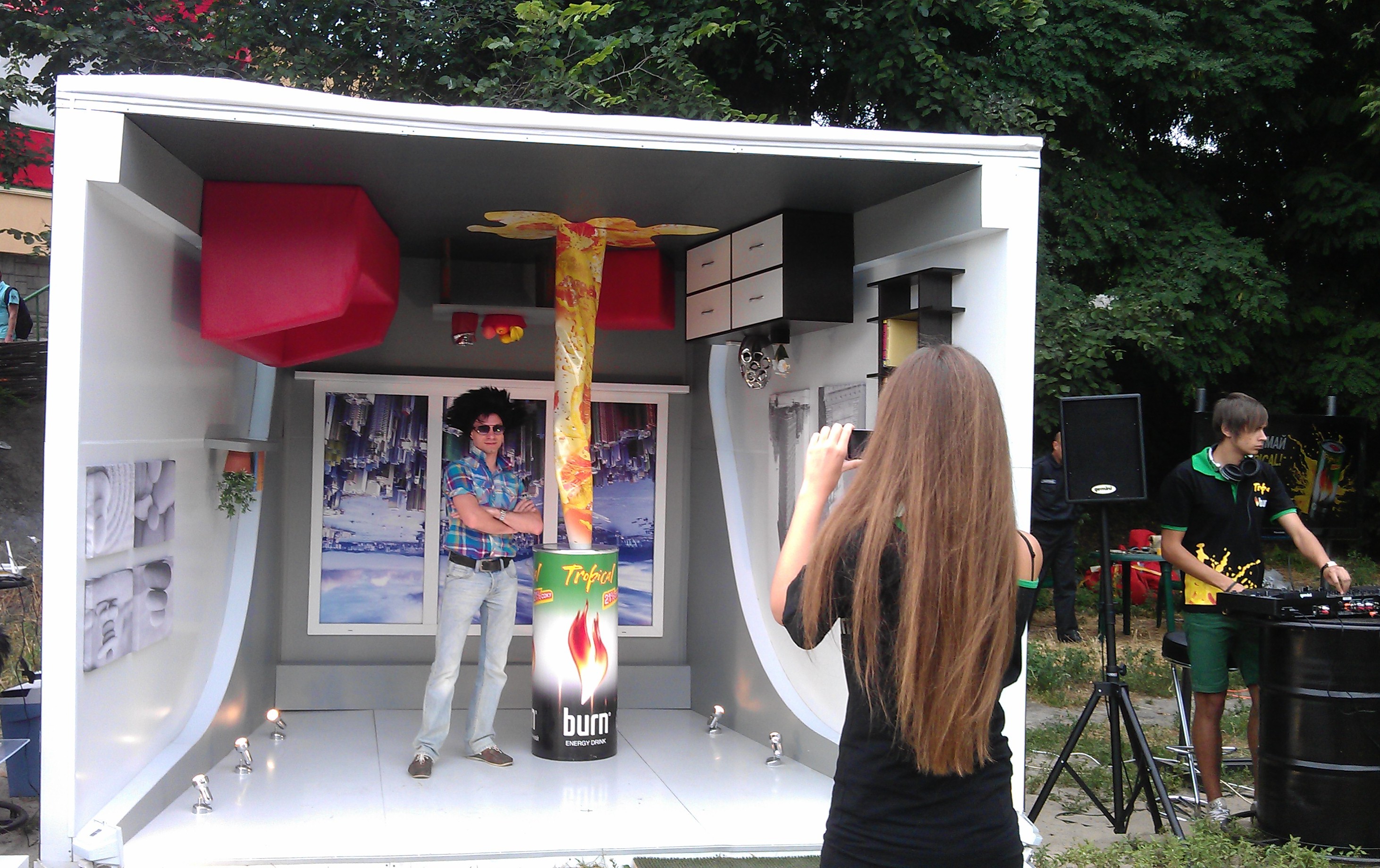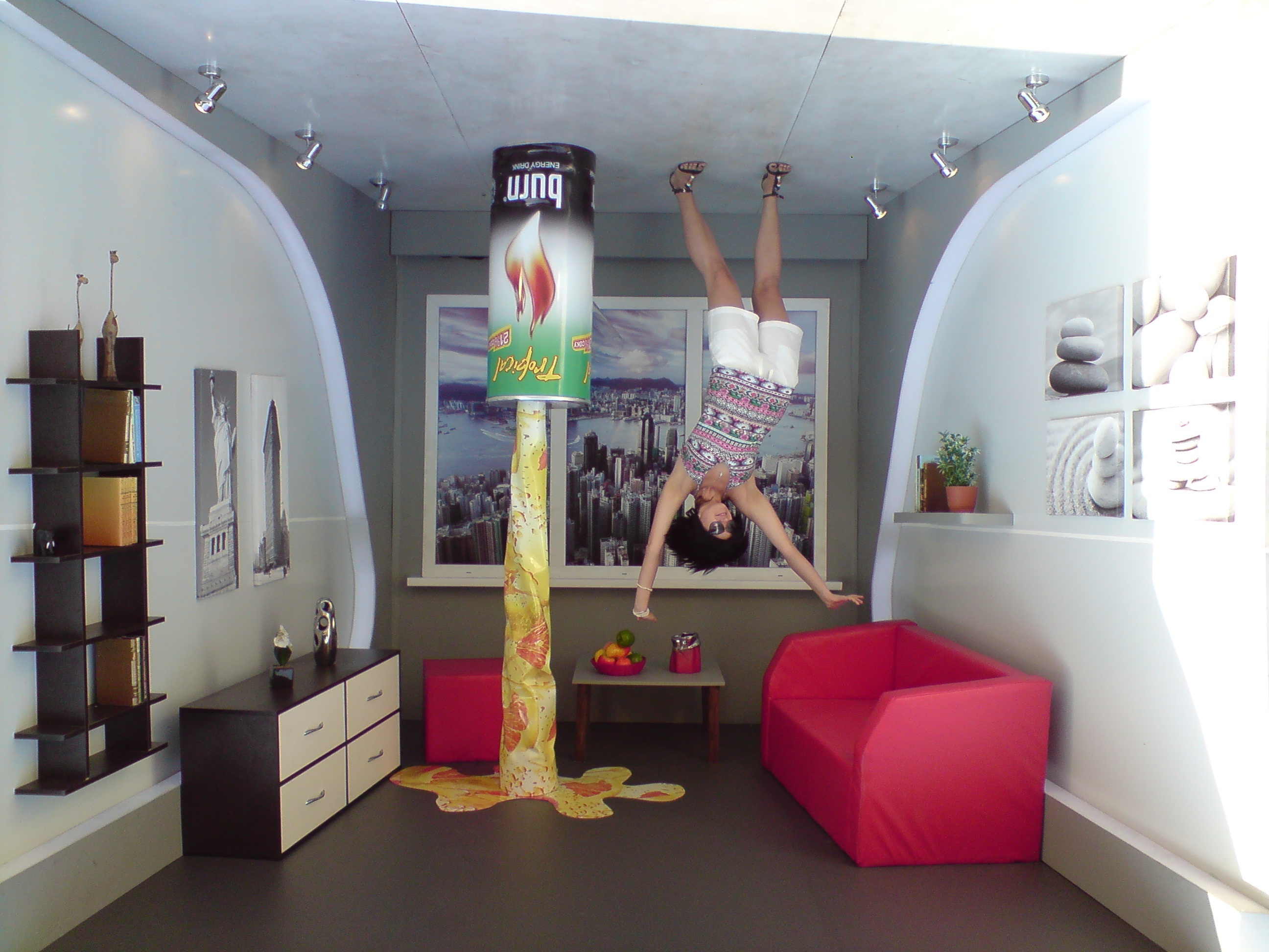 В центре комнаты установлена огромная банка «Burn Tropical» с напитком, который «выстреливает» ярким фонтаном.