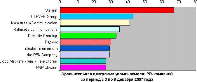 По результатам анализа за период с 3 по 9 декабря 2007 года, лидером по упоминаемости стало PR-агентство Starget, упоминание этой компании было зафиксировано в 67 публикациях в течение недели. Можно выделить две основные темы публикаций с упоминанием этого агентства. Самым резонансным для PR-агентства информационным поводом стала реализация комплексного проекта для компании ARDO в рамках Wanted Design Week. Немного меньше СМИ уделили внимания участию PR-агентства Starget в открытии первого имиджевого магазина New Holland.