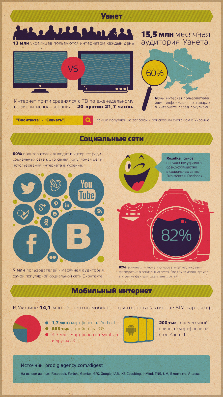 Сколько на самом деле украинцев каждый день выходит в интернет? Правда ли, что подавляющее большинство из них живет в Киеве? Какие операционные системы используют украинцы на мобильных телефонах? В Дайджесте Уанета 2012 от Prodigi собраны ответы на самые главные вопросы об украинском интернете.