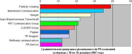 Самой упоминаемой компанией, работающей на украинском рынке PR-услуг в течение прошедшей недели, с 10 по 16 декабря 2007 года, стала Компания стратегических коммуникаций Publicity Creating. Эта компания упоминалась в 39 публикациях анализируемых СМИ. Больше всего сообщений с упоминанием анализируемой компании было посвящено конкурсу "ДієСлово" на лучший статейный материал по тематике "Рынок PR в Украине". Также значительное внимание СМИ уделили заключению соглашения о сотрудничестве на 2008 год между Publicity Creating и Киевской Международной Контрактовой Ярмаркой. В соответствии с соглашением предусматривается организация программы семинаров и презентаций в рамках выставок "Строительство и Архитектура" (весна и осень 2008 г.).