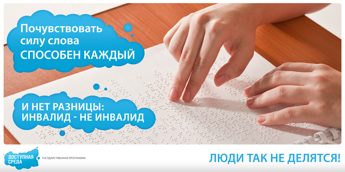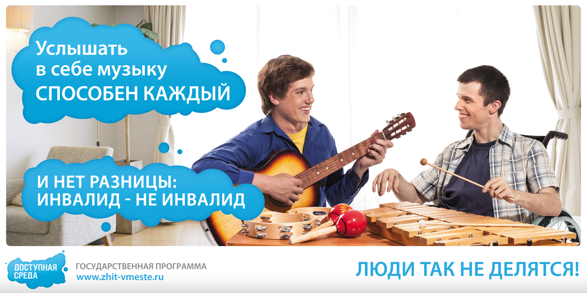 Концепция раскрывает основную идею государственной программы «Доступная среда»: люди не делятся на инвалидов и не инвалидов, на плохих и хороших – «Люди так не делятся!». В наружной рекламе и Интернете общим слоганом кампании стала фраза «Способен каждый». Ведь, действительно, любой человек может радоваться жизни, получать удовольствие от общения, музыки и литературы, каждый человек способен дружить и любить – вне зависимости от своего физического состояния. В телевизионном и радиоролике та же идея раскрывается через слоган «Каждый из нас особенный». Этот слоган подчеркивает, что не существует каких-то «особенных» людей, потому что все мы отличаемся друг от друга – своими пристрастиями, вкусами и увлечениями. И эти отличия гораздо интересней и важней, чем отличия внешние.