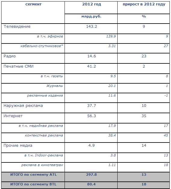 Комиссия экспертов Ассоциации Коммуникационных Агентств России подвела итоги развития рекламного рынка России за 2012 год. Объем рынка рекламы в сегменте BTL-услуг составил 80,4 млрд.руб., что на 18% больше, чем аналогичный показатель 2011 года.
