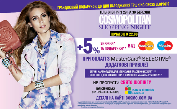 Этой весной Cosmopolitan Shopping Night прошел в 2 крупных шоппинг-моллах Украины – в Киеве и Львове. Кроме возможности приобрести товары со скидками на межсезонной распродаже, для картодержателей MasterСard и Maestro были приготовлены дополнительные скидки, приятные подарки и ряд других исключительных привилегий.