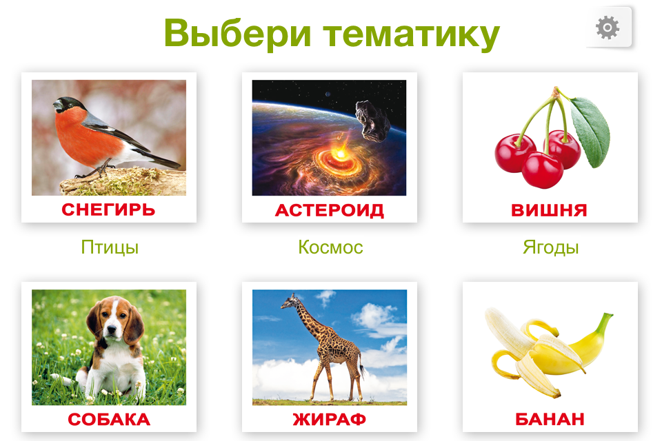Приложение представляет собой серию из 20 тематических наборов карточек на самые разнообразные темы: птицы, животные, профессии, овощи, спорт, породы собак и многие другие. Каждая тема предлагает ребенку двадцать озвученных красочных карточек. Для совсем маленьких подойдет режим простого показа картинок. Детей  постарше заинтересуют факты, которые сопровождают карточки. В завершение каждого показа вундеркиндам предлагается три увлекательных задания на определенную тему: «подбери картинку», «подбери подпись», «игра мемо».