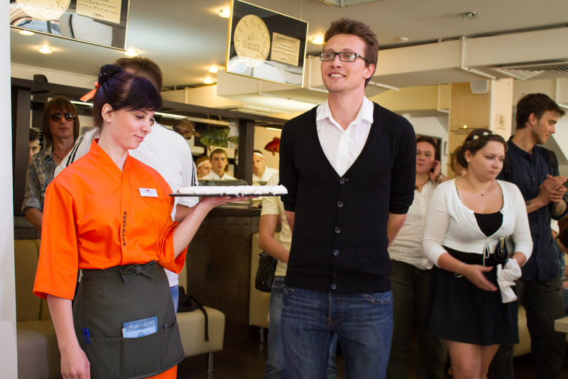 Что из чего может получиться показал на открытии Клуба и молодой харьковский художник Андрей Безпамятный. Из продуктов, которые используются в японской кухне, и из готовых суши, приготовленных тут же, на суши-баре, Андрей создал на глазах у гостей полностью съедобную и при том нежную и детализированную картину. Сюжет съедобного полотна был классическим для японской живописи: ветка цветущей сакуры и, вдалеке, — человек на рыбацкой лодке. “Японская живопись — одна из самых удивительных, она всегда меня невероятно вдохновляла, — рассказывает художник. — Но делать в этом жанре что-то после Великих, при том когда ты даже не японец — как-то нелепо. Пришлось идти обходным путем и реализовывать классический сюжет в неклассической технике. И очень признателен Сергею Рудичу и его команде за то, что они помогли мне справиться с задачей”.