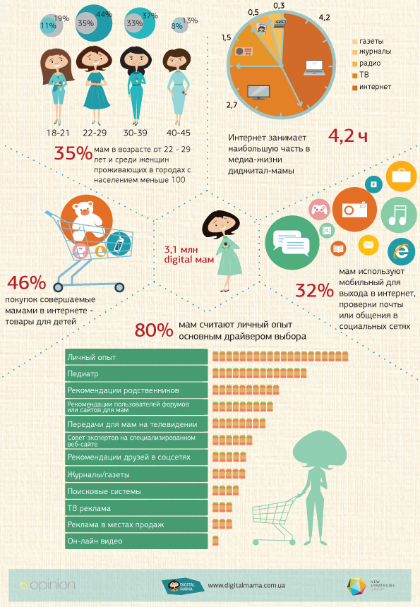 Типичная digital-мама – это женщина в возрасте 22-29 лет с высшим образованием и средним доходом, которая находится в декретном отпуске и воспитывает одного ребенка в возрасте до 6 лет. Основными драйверами выбора товаров для такой мамы являются личный опыт, советы педиатра, родственников, а также рекомендации пользователей форумов и сайтов для мам.