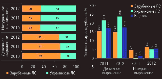 По итогам 2012 года, объем рынка составил 31, 7 млрд. грн., что на 17% больше показателей 2011 года. Эксперты отмечают рост потребления и производства препаратов. По данным исследований, 90% продаж препаратов происходит в аптеках, и лишь 10% достаются больницам и клиникам. Следовательно, движение на рынке обеспечивается в основном по «запросу покупателя».