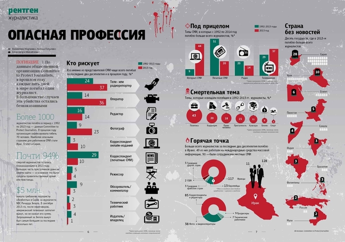 Более 1000 журналистов погибло в период с 1992-2013 год. В прошлом году организация зафиксировала гибель 70 человек. Наиболее опасными странами для работников СМИ стали Ирак, Сирия, Египет, говорится в инфографике портала