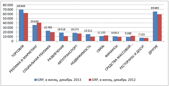 Торговля стабильно занимает лидирующие позиции. Из всех рейтингов, доступных на рынке, 13% занимает категория "Реклама и Маркетинг", которая состоит в основном из зафонированных рекламоносителей (довисания не учтены). Категория «Развлечения» активно набирает рекламный вес.