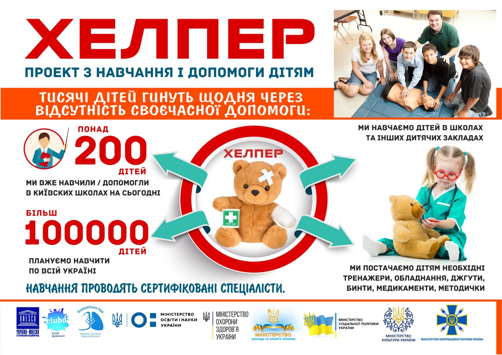 Хелпер – проект, що покликаний формувати національну культуру надання першої домедичної допомоги, зменшувати рівень смертності та продовжувати тривалість безпечного життя, впроваджувати профілактику серцево-судинних захворювань. Існує багато країн, де подібні системи навчання давно впроваджені на всіх рівнях шкіл, ВНЗ та спец навчальних закладів. Система почала запроваджуватись ще після 2-світової війни, але ми бо загубили ті напрацювання, які були, уже після розвалу СРСР, бо незалежна Україна не звертала увагу на цей предмет.