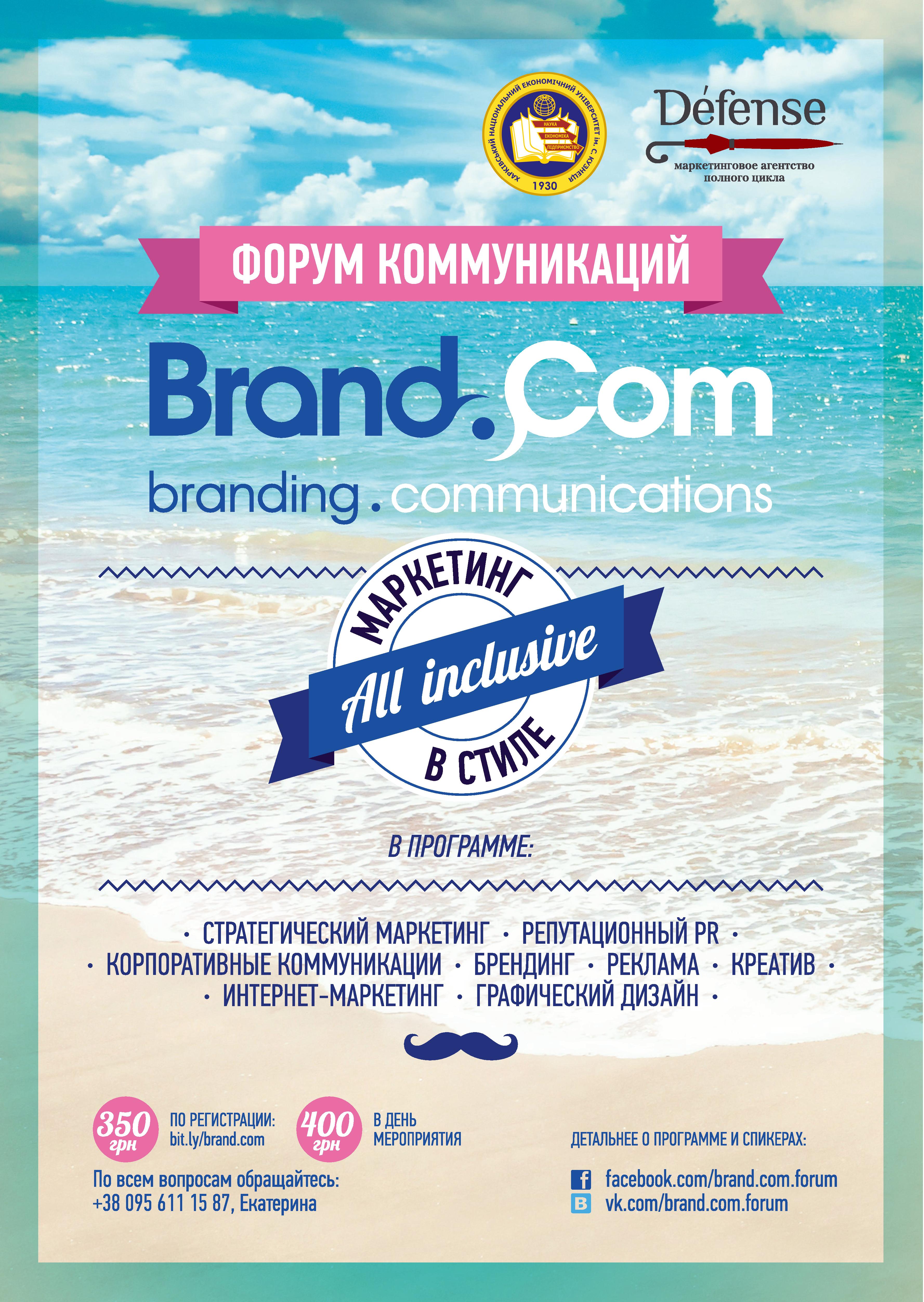 «Brand&Com» 2015 – это 8 часов форума, 15 экспертов маркетингового рынка Украины, эксклюзивные интенсивы и мастер-классы, а также возможность лично пообщаться с профессионалами в неформальной обстановке.