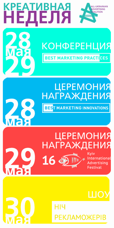 Дождались! Май на носу и скоро главное событие украинского рекламно-коммуникационного рынка и один из ведущих фестивалей в сфере рекламы – Киевский Международный Фестиваль Рекламы, ну и не только. В мае на рекламистов ждет очень насыщенная креативная неделя. Желаем удачи в последнем рывке перед дедлайнами – еще немного и скоро вы сможете почивать на лаврах креативной славы.