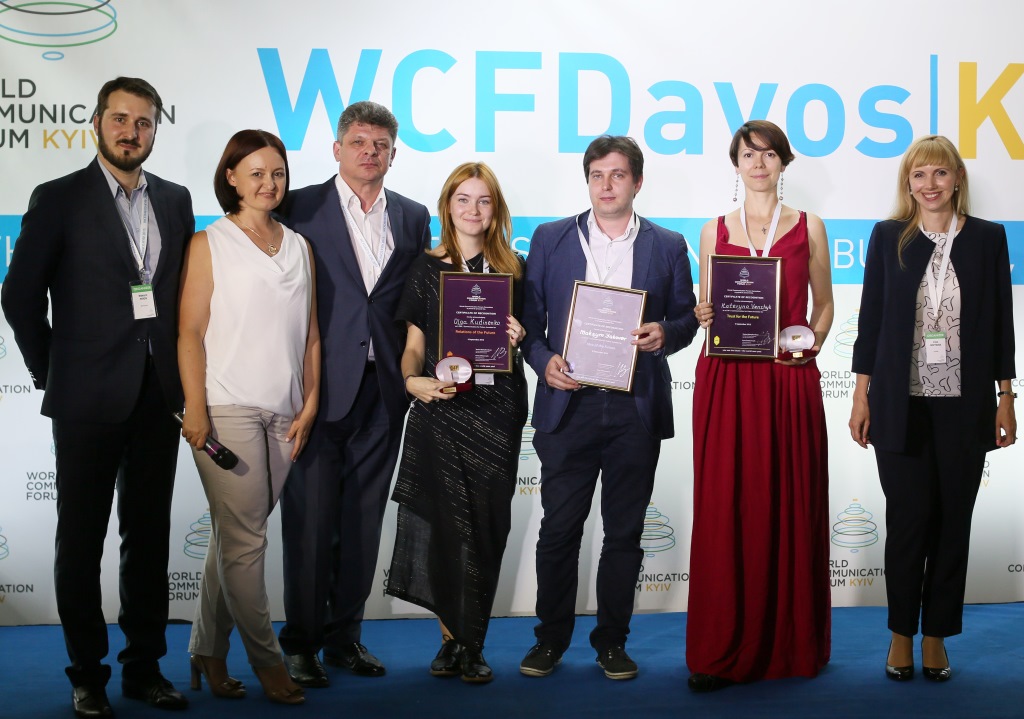 Коммуникации будущего: Максим Перов (оргкомитет награды), Ирина Золотаревич (член глобального комитета WCFDavos и эксклюзивного представителя WCFDavos в Украине, директора PR&GR сервисов AGAMA communications), Сергей Макаренко (директор по связям с органами власти и общественностью PepsiCo в Украине), Ольга Кудиненко (обладательница награды Relations of the Future за благотворительный проект «Таблеточки»), Максим Яковер (обладатель награды Idea of the Future за создание креативного пространства «Часопис»), Катерина Венжик (обладательница награды Trust of the Future, главный редактор портала «Дело.ua»), Ирина Новаикова (СЕО AGAMA сommunications).
