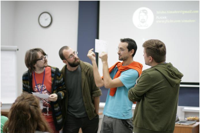 Тренеры поделились с участниками своим  опытом работы. Михаил Симаков – ведущий дизайнер инфографики – рассказал о работе их отдела в газете «Московские новости», о взаимодействии внутри команды, какие схемы работы они пробовали и на чем остановились. Все таки хорошая инфографика – это работакомандная.