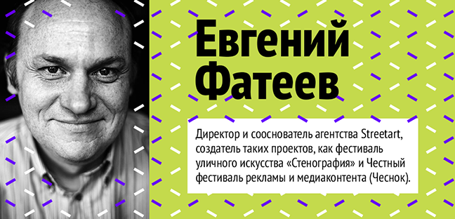 Директор и сооснователь агентства Streetart, создатель таких проектов, как фестиваль уличного искусства «Стенография» и Честный фестиваль рекламы и медиаконтента (Чеснок).
