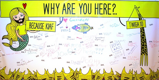 Судя по автографам на баннере «Why are you here?», гости КМФР’15  прибыли на церемонию с такими основными целями: 1) because любят рекламу и хотят заполучить  долгожданную тарелку; 2) because пришли пропиарить свою компанию на том же баннере; 3) because больше негде высказать свои политические предпочтения, используя современные способы нецензурной аббревиации; 4) because TWIGA Ukraine отмечает 10 лет!
