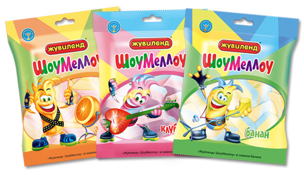 «О, да это жевательные сладости… такие мягкие, пружинистые. Класс!  Это точно для детей!», - сказали на предварительных фокус-группах юные потребители. Попробовав конфеты, они были единодушны в том, что на упаковке нужно изобразить что-то веселое и крутое. Так на свет с помощью художников рекламного агентства родилась компания «мягких», «воздушных» и «прыгучих» рокеров ШоуМеллоу. Само же название линейки как намекает на продуктовую категорию «маршмеллоу», так и подчеркивает общую концепцию бренда, поскольку «Жувиленд» - это сладости для тех, кто любит и хочет веселиться.