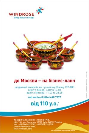 В октябре стартовала рекламная кампания «Розы Ветров» - молодого игрока на рынке авиаперевозок Украины. В кампании задействованы: пресса, интернет, наружная реклама и радио. Креатив обеспечивает агентство Kaffeine Communications.